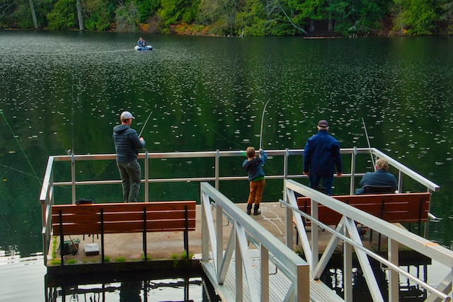 Durrance Lake is also a popular summer swimming destination as well as a popular fishing spot as it is stocked with rainbow trout. There is a fishing dock with an accessible pathway and ramp leading down to it. There is also a paved boat ramp near the parking area for launching non-gas powered watercraft.
